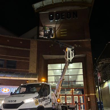 In Southend-On-Sea, Essex, We cleaned off the graffiti at the odeon cinema using a cherry picker & a hot wash. this job was carried out at 2am to avoid any disturbance.